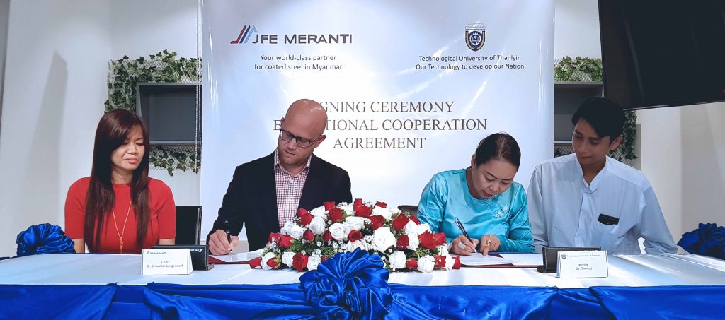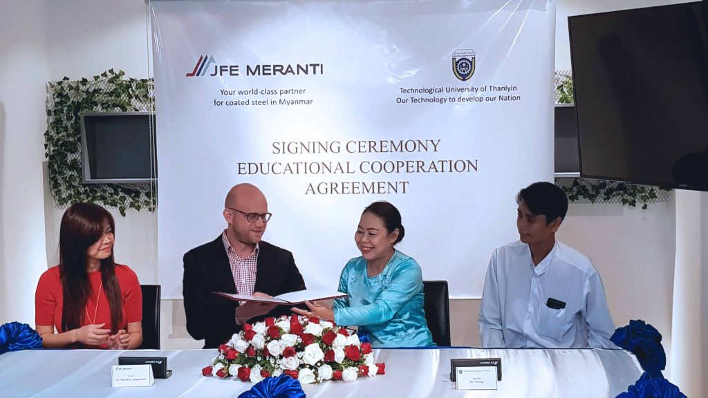 TTU is a leading Myanmar university in various engineering and technology disciplines. The agreement provides initiatives that will advance the educational and developmental interests of both parties. JFE Meranti will award scholarships, internships, and training seminars, to students who excel in the fields of Mechanical, Electrical, and Chemical Engineering. These programs give opportunities to students to test skills learned in the classroom, expand their knowledges through related work experience, and to transfer international expertise in the steel industry and its associated technology and practices to the future generation of Myanmar.